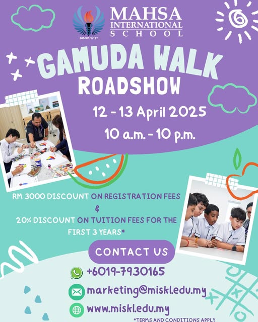 ๐ŸŽ‰ Join us for an exciting 2-day roadshow at Gamuda Walk on April 12th & 13th! Whether you're actively searching for a top-tier international school or just curious about what MISKL has to offer, this is your perfect chance to learn more. You can even set an appointment for a campus tour to experience our vibrant school life firsthand!